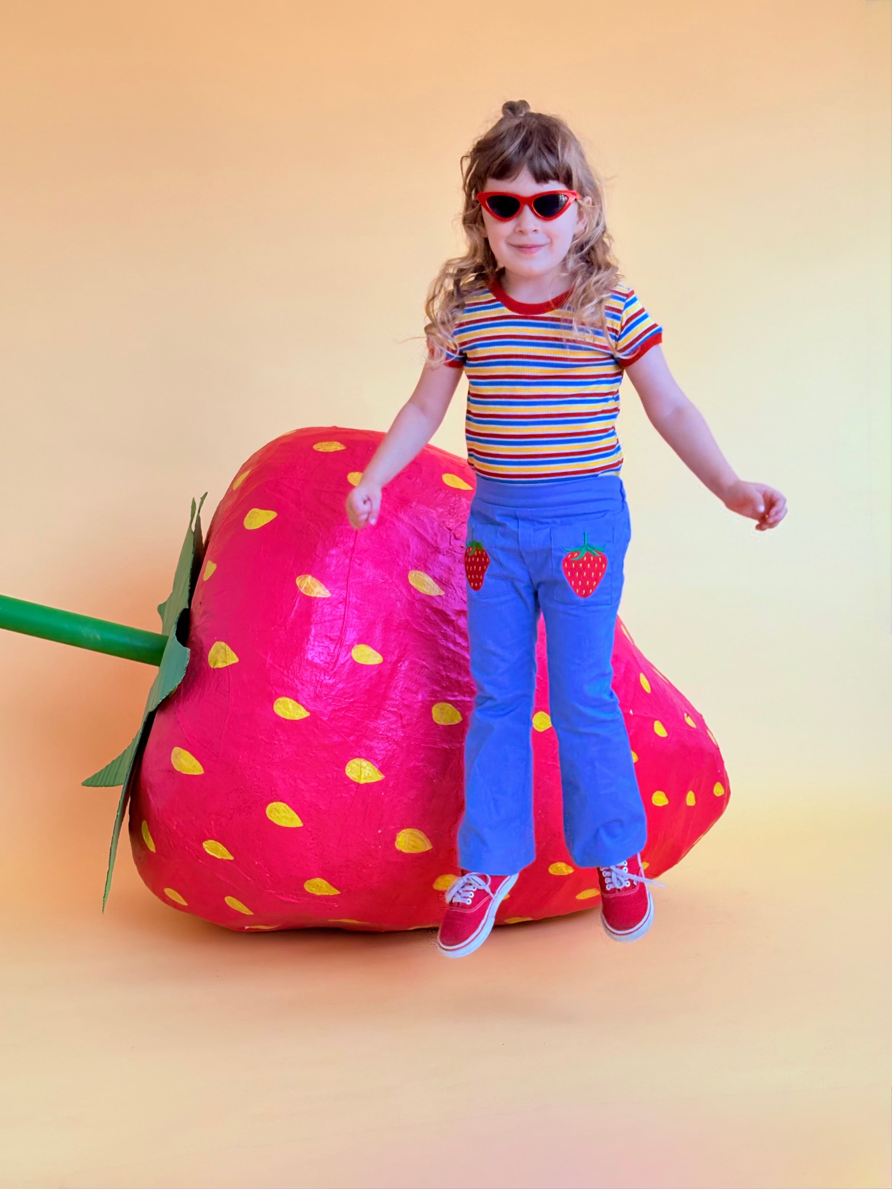 One of my favorite pieces from our new collection! These adorable bell bottom pants are made with a lightweight, comfy cotton fabric and feature the cutest little embroidered strawberry pockets. So darling!